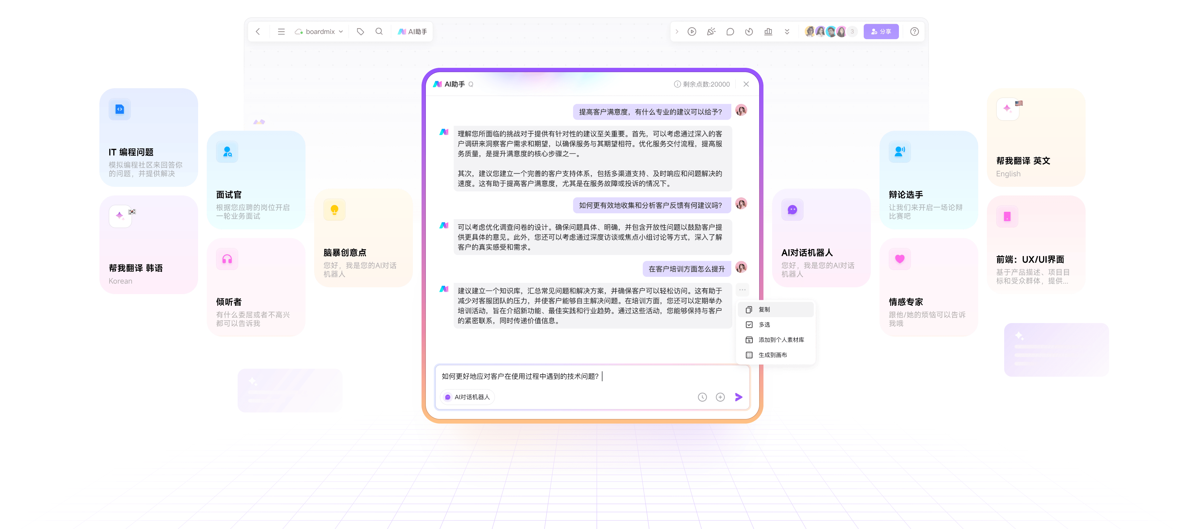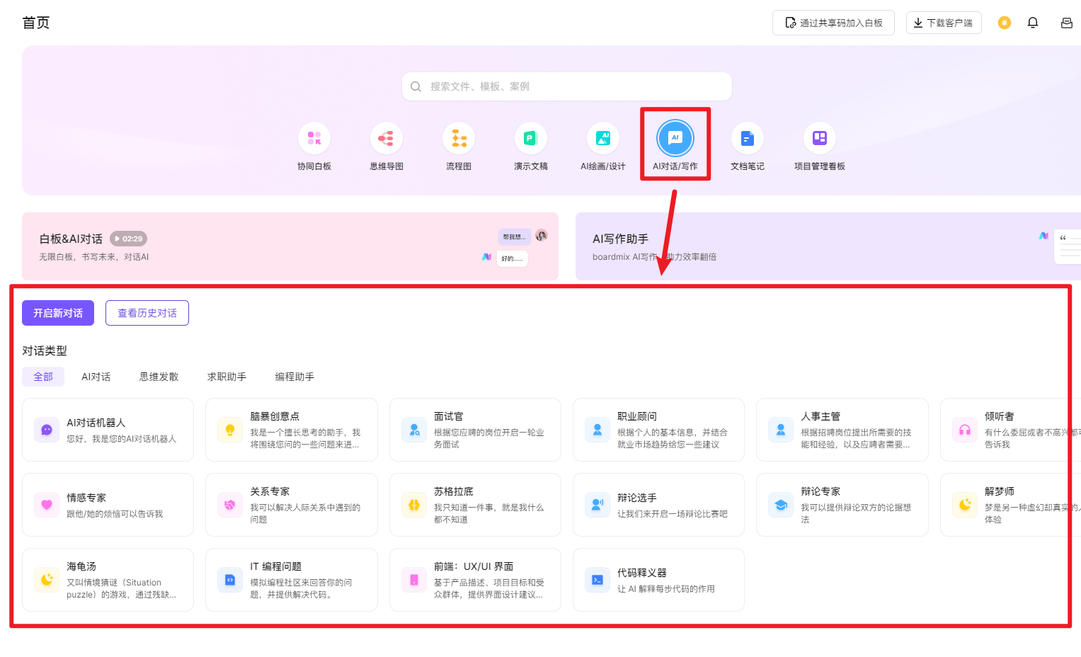AIGC高效创做:boardmix博思白板内有基于AI创做各类内容的东西。