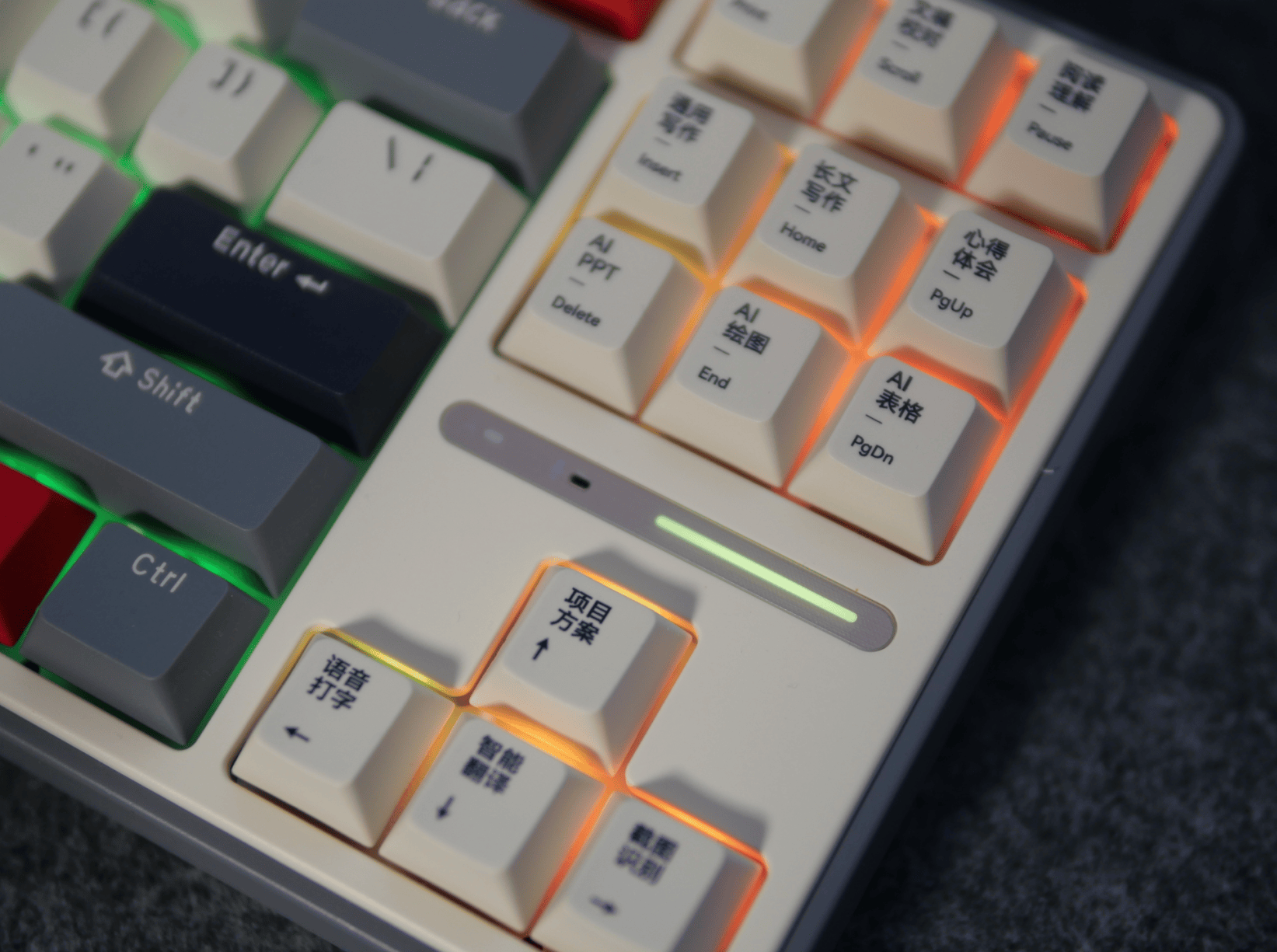 标的目的键上方是麦克风一根RGB灯条,其实内容要更丰硕,现正在可能几分钟就能搞定了。比来咪鼠推出了旗下第一把大配列的MK87 AI机械键盘,若是你想换成更好的轴体,好比AI翻译能够翻译整篇文档,然而它还很是主要,由于分歧的AI功能存正在差别,所以时下国产机械键盘逃求的“HIFI声音”体验它一样是能够供给的,
