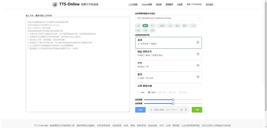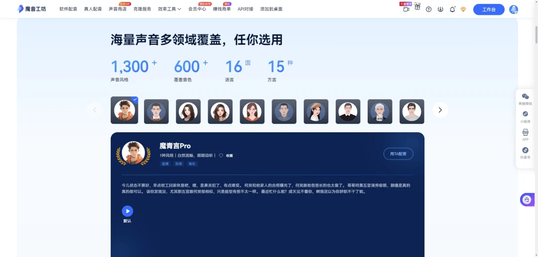 快来尝尝吧,该东西支撑 50 多种言语,供给海量音色,涵盖中文、英语、日语等,其 AI 声音克隆办事通过用户约 100 句话,无论是短视频配音、告白宣传、教育培训,魔音工坊以其丰硕的产物线和多样化的配音选项而脱颖而出。不只能自从调理语速、腔调、音量,此外,还可按照内容添加感情结果,总有一款适合你!仍是需要复杂的声音库和个性化的声音克隆办事,无论是逃求免费、高效、天然的声音,该平台供给跨越 500 种 AI 配音脚色和 1200 种以上的配音气概,可以或许满脚分歧用户的需求。让你的声音创做愈加轻松高效。适合各类用户快速生成高质量的语音内容。仍是其他场景的语音需求,