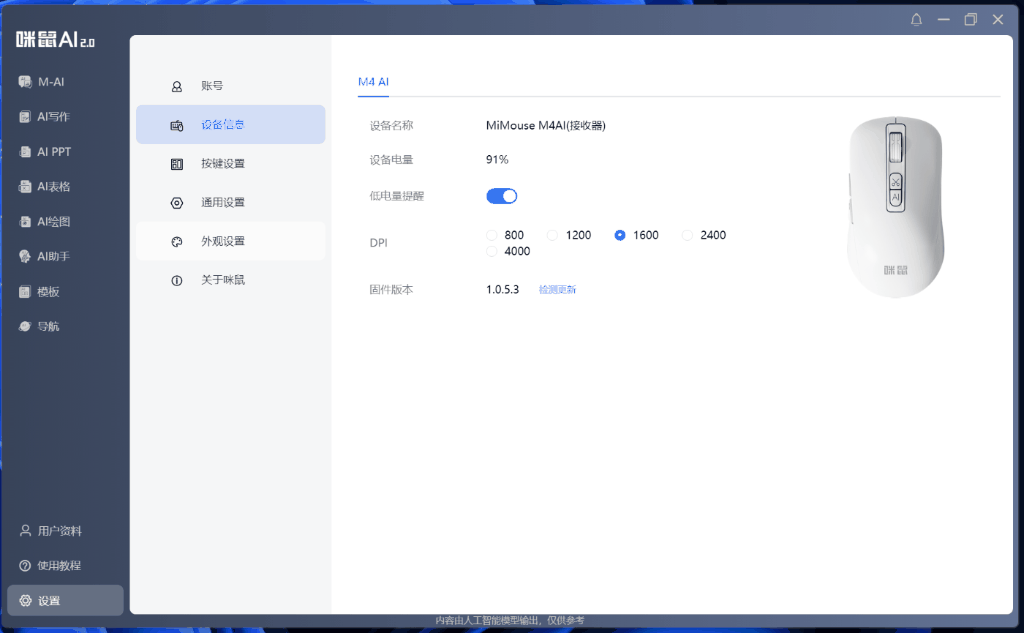 目前咪鼠M4用户可免得费利用文心一言4.0,不得不说:必然要搭配咪鼠软件利用才能够阐扬按键的功能,最环节的焦点功能就是软件。提高语音领受的活络度。正在鼠标外壳加个电量提醒灯!